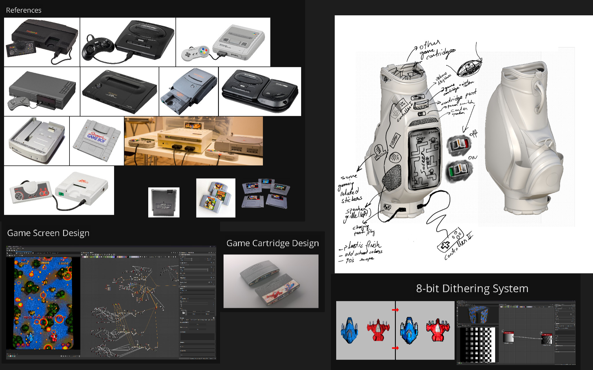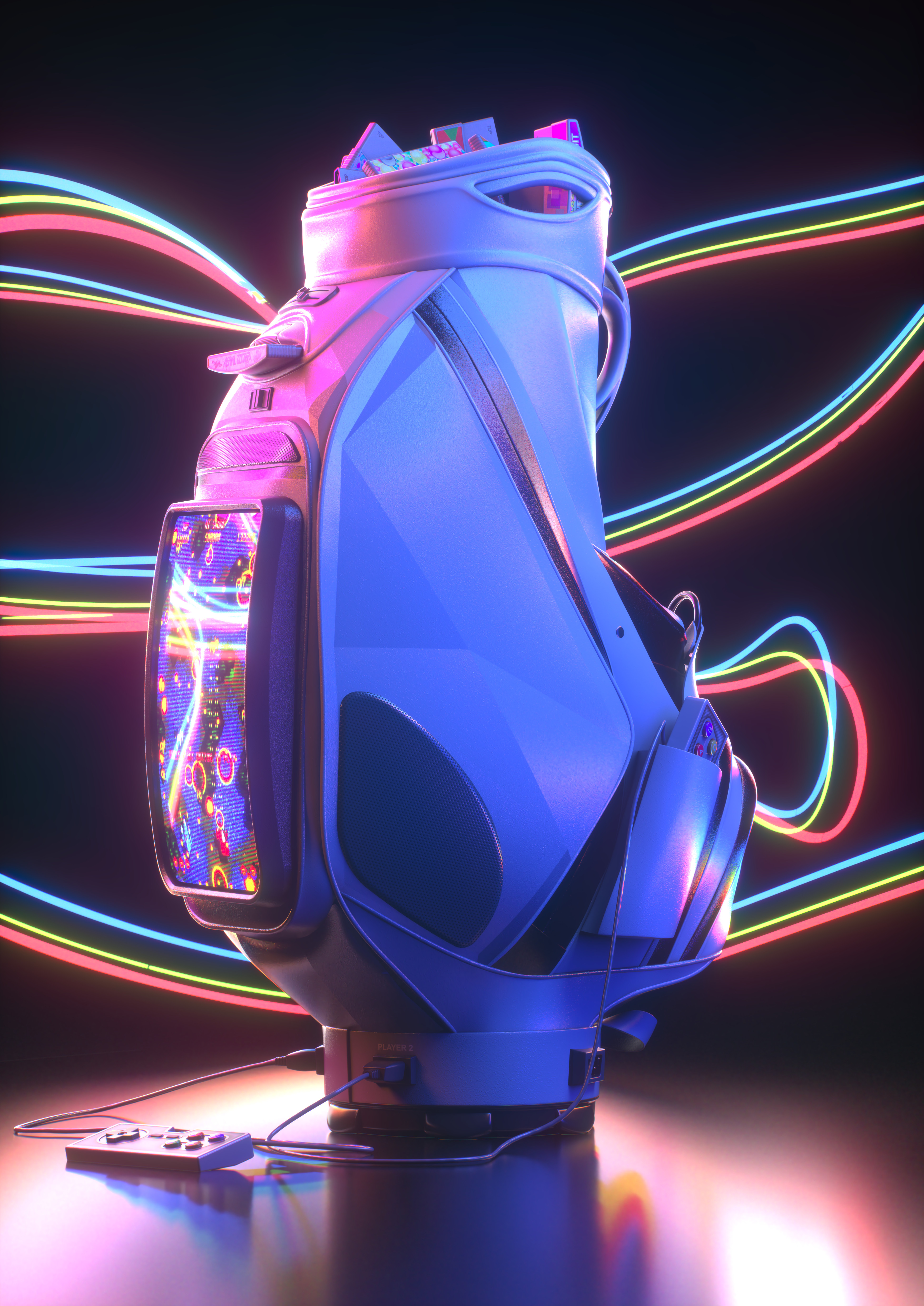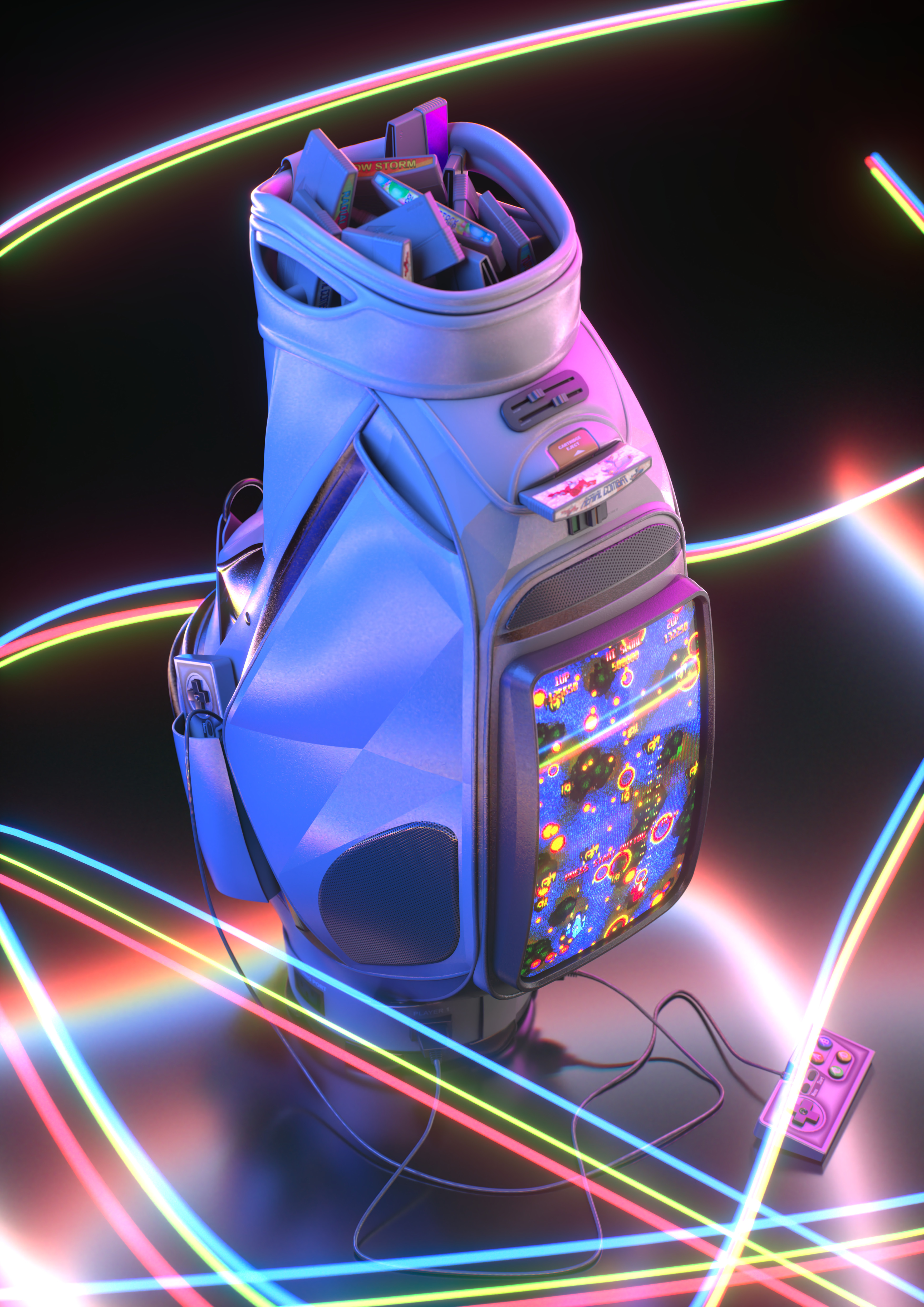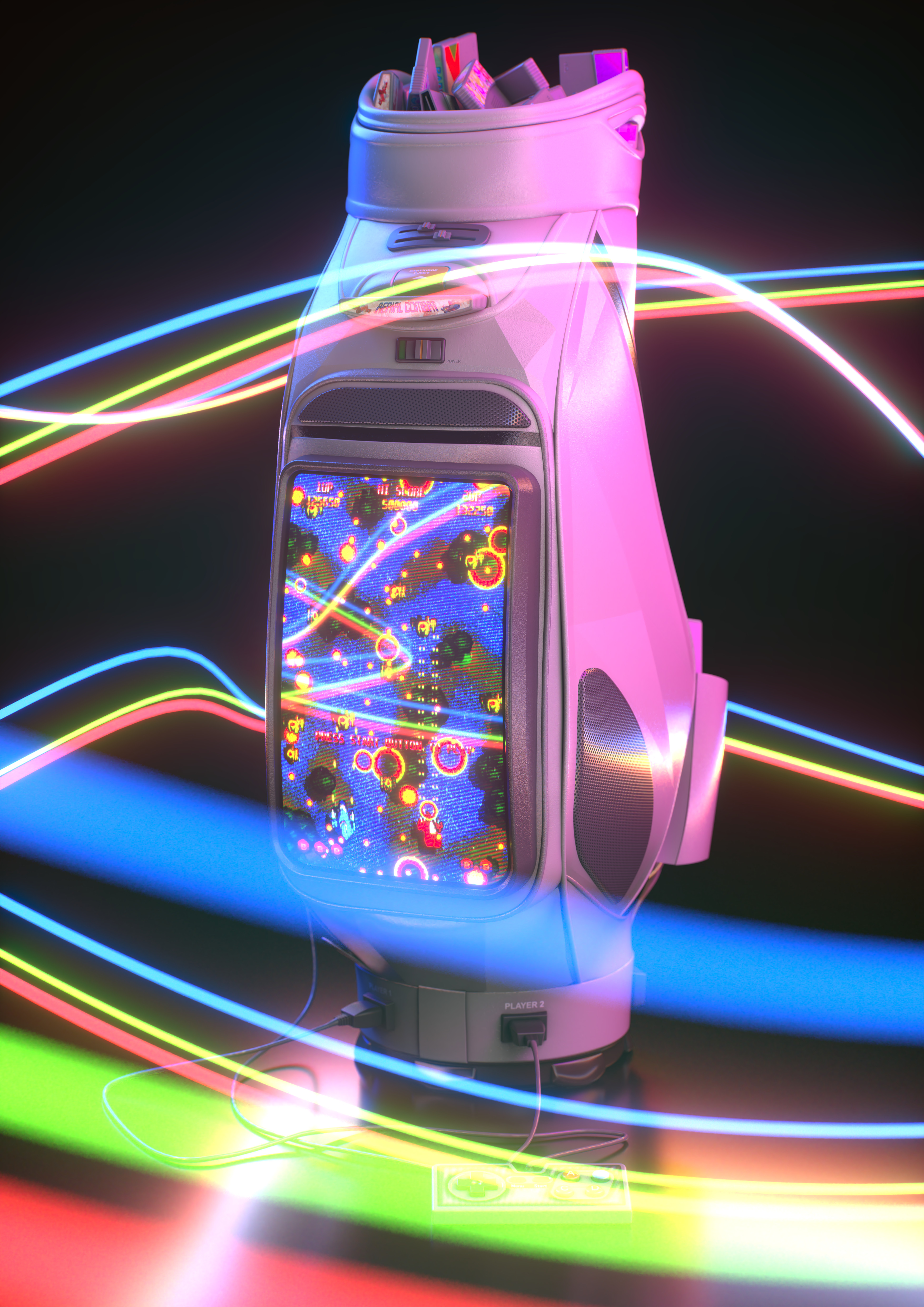 I imagined the golf bag as a portable game station full of game cartridges with 90s technology. It has a big rechargeable battery inside and is played with game cartridges and two gamepads. It shows the pixel-based games on a vertical CRT screen.