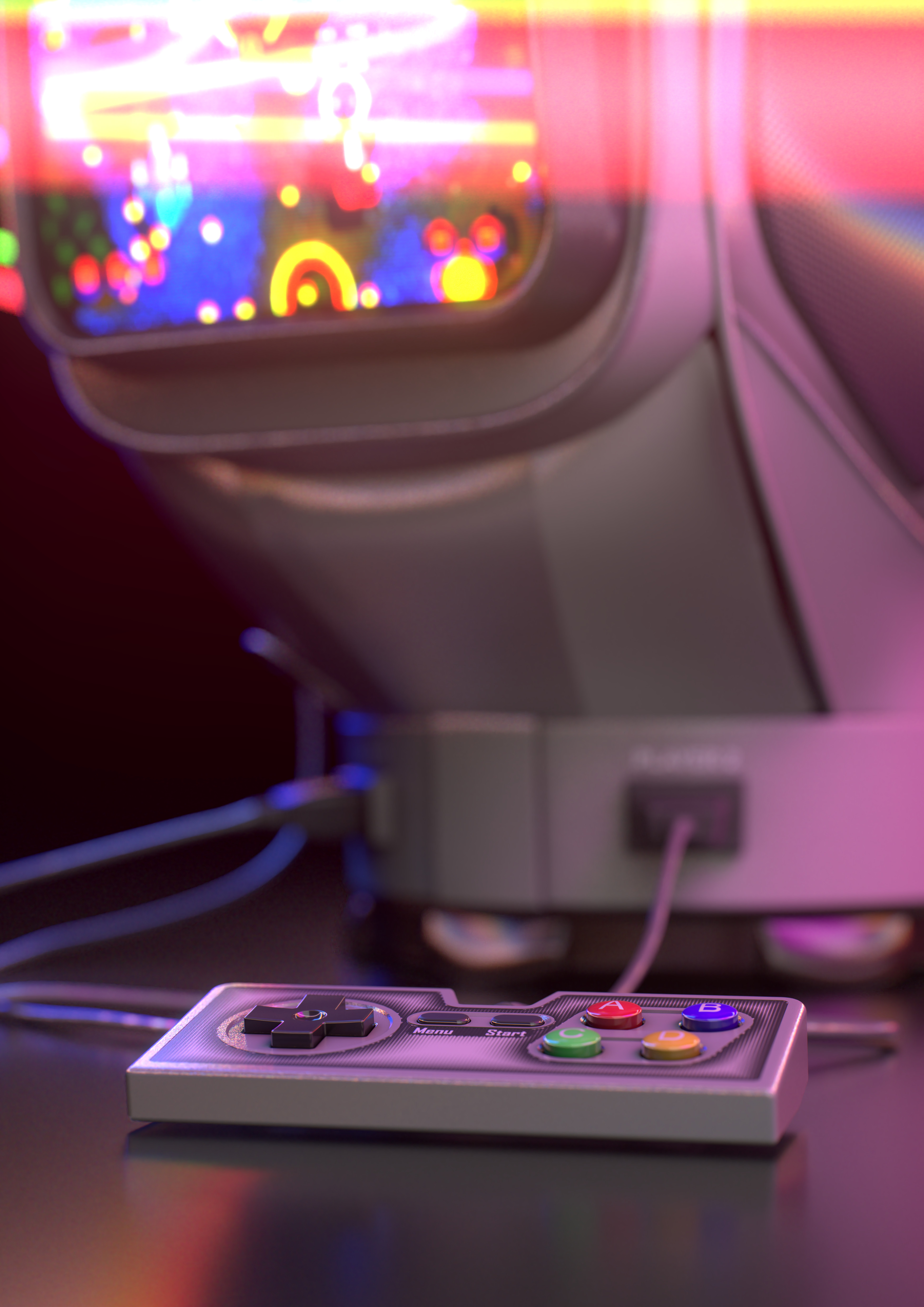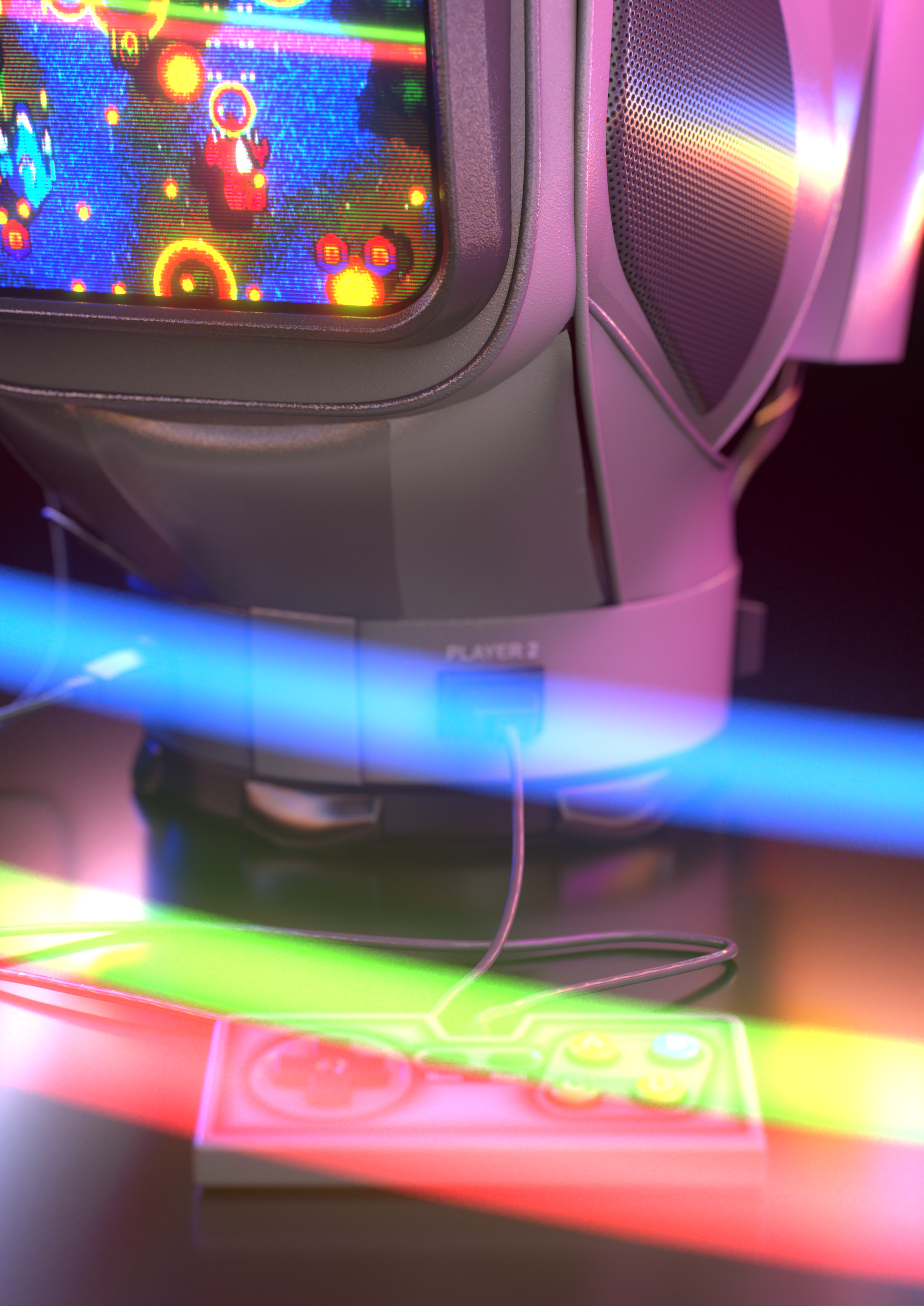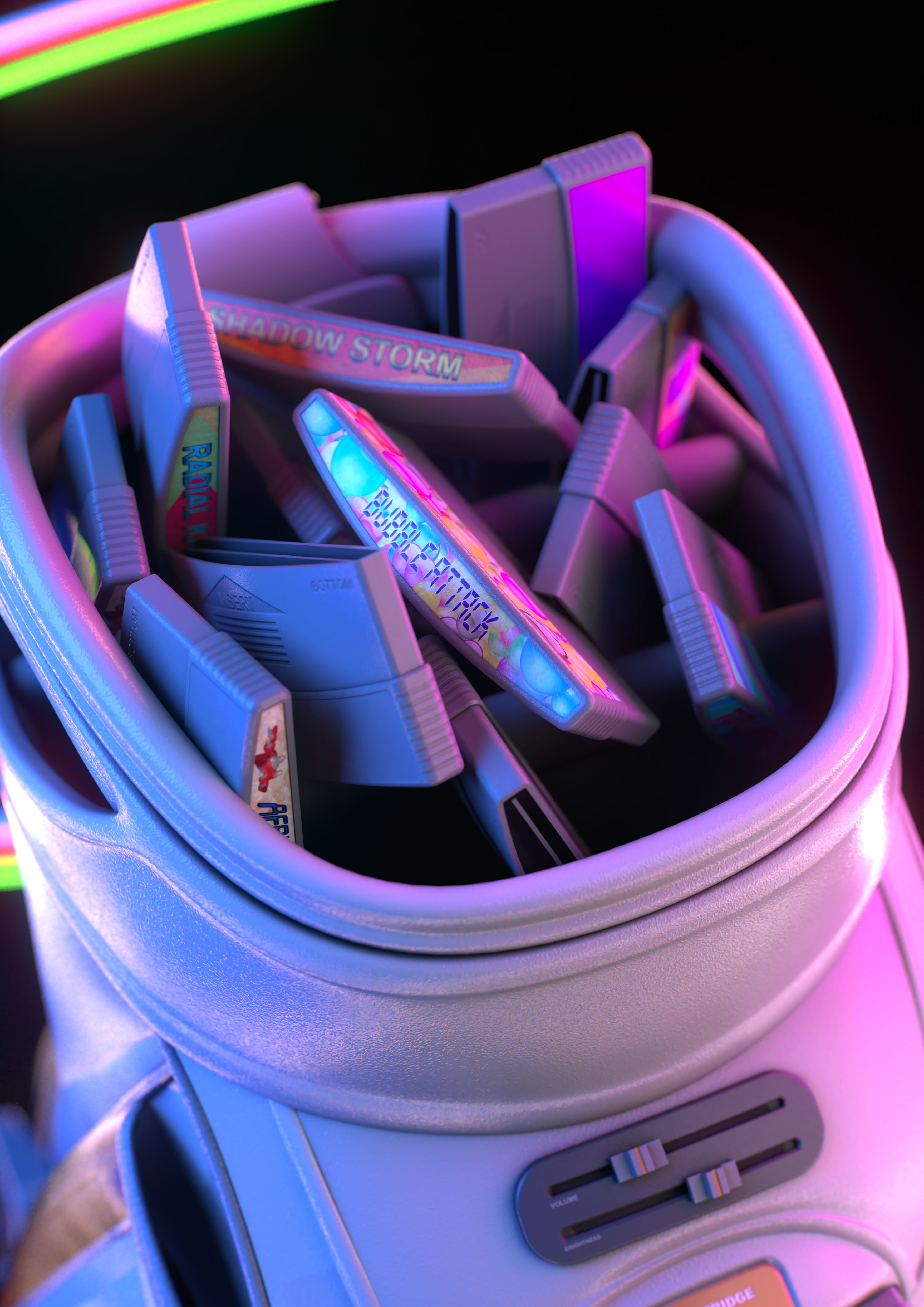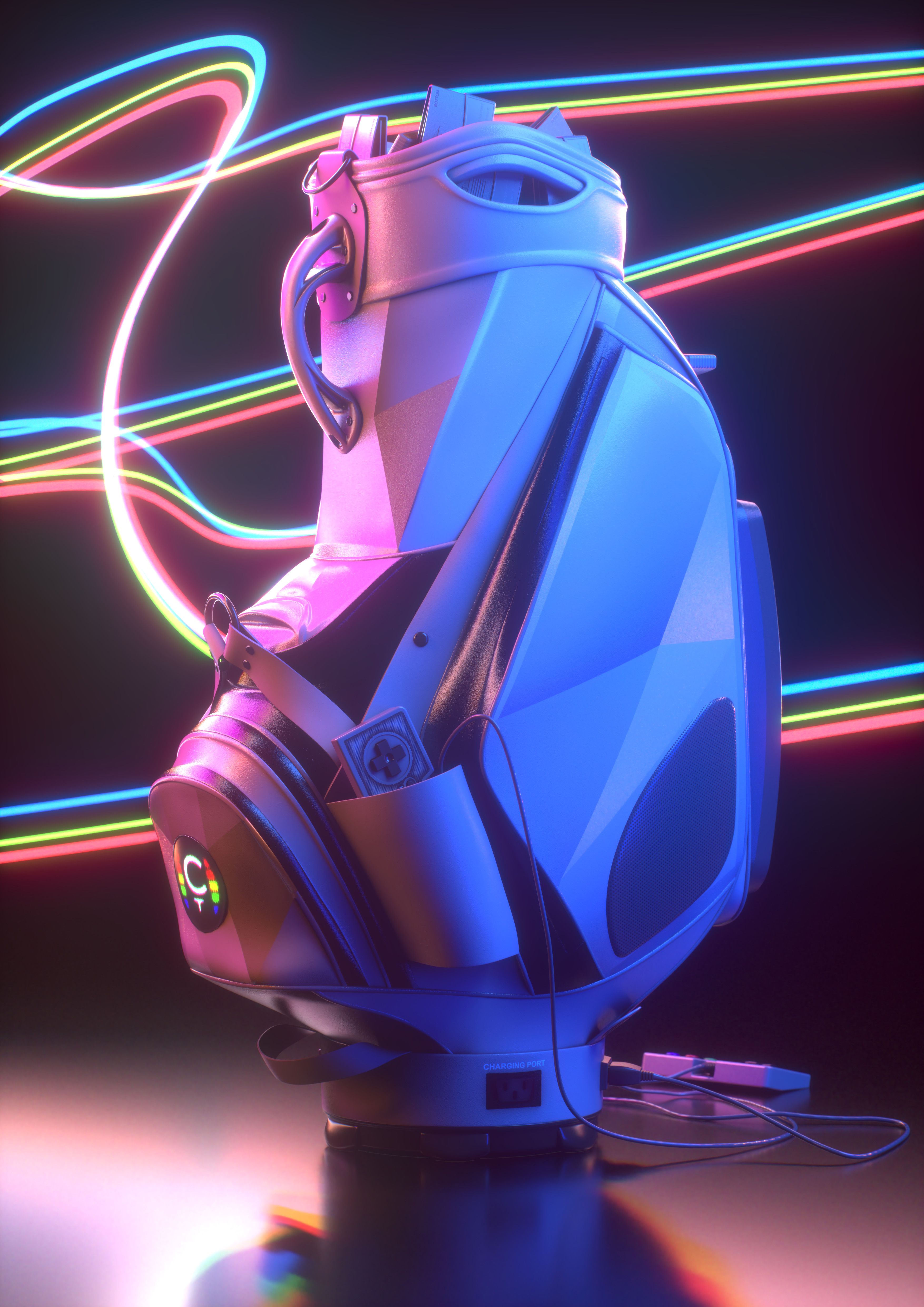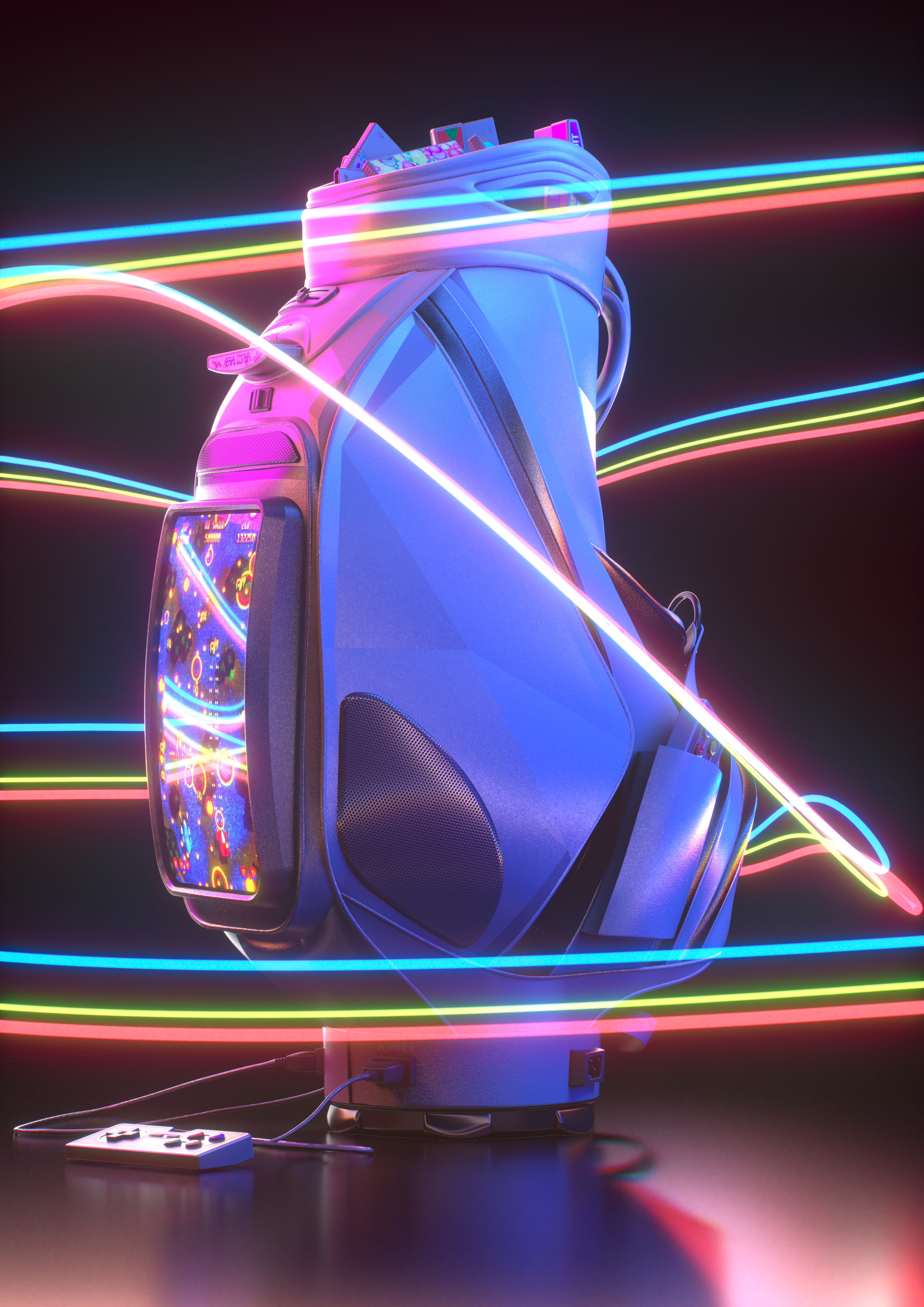I imagined the golf bag as a portable game station full of game cartridges with 90s technology. It has a big rechargeable battery inside and is played with game cartridges and two gamepads. It shows the pixel-based games on a vertical CRT screen.